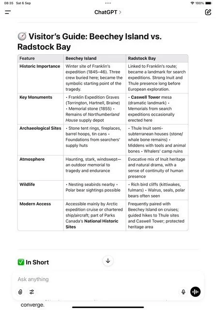 ✅ In short: On Beechey Island today you’ll find the Franklin graves, memorials, ruins of rescue depots, scattered relics, and a stark Arctic wilderness—a site both archaeological and deeply symbolic in the history of polar exploration.