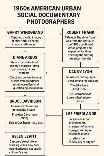 In 1960s America, urban social documentary photography thrived during a period of civil rights activism, urban renewal, and cultural change. Several photographers made lasting contributions by documenting everyday life in cities, often focusing on marginalised communities and shifting social landscapes.